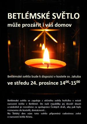 Betlémské světlo se zapaluje z věčného světla hořícího v místě narození Ježíše v Betlémě. Do naší republiky jej dováží skauti a následně je rozváženo za spolupráce Českých drah, aby pak bylo rozneseno do kostelů, domácností...